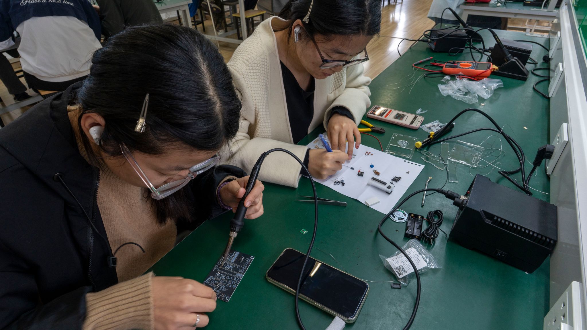 本次比赛聚焦实际应用,要求选手完成电路板元器件焊接、线路焊接、焊点质量检测、电路调试等一系列实操任务,重点考查选手的焊接精准度、操作熟练度、工艺规范性以及问题处理能力。比赛现场,选手们全神贯注,手持电烙铁精准操作,焊锡在烙铁头下均匀融化,一个个规整、牢固的焊点快速成型。大家严格遵循焊接操作流程,细致处理每一个元器件、每一条线路,专注打磨操作细节,力求做到焊点光滑、无虚焊、无漏焊。评委老师从焊接质量、操作规范、完成效率、电路性能等多个维度,对参赛作品进行了逐一细致评审。