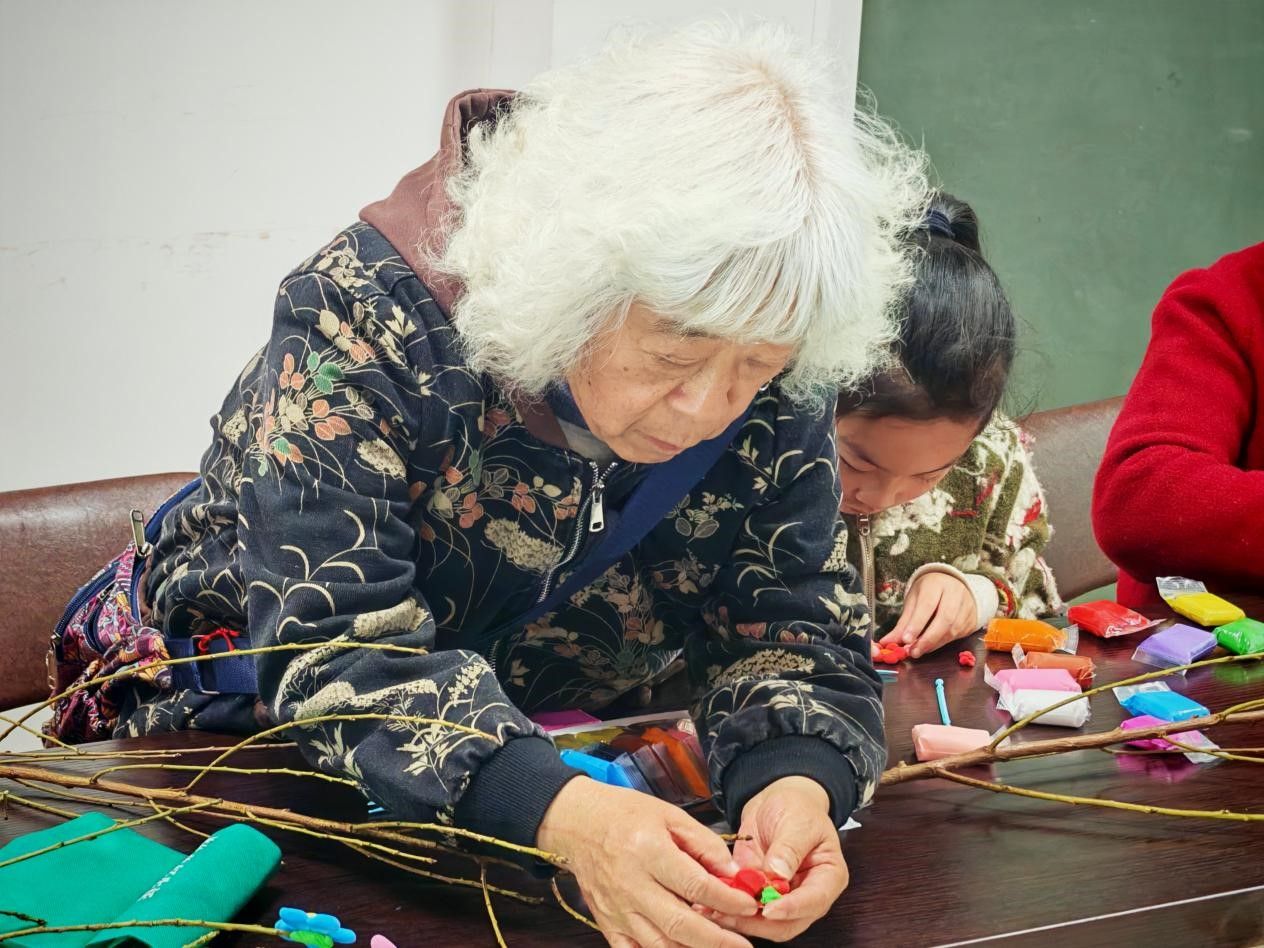 本次活动以手工制作为纽带,精准契合老年群体心理需求——手工创作的专注的过程能帮助老人转移负面情绪、锻炼思维活力,而“枯木逢春”的主题寓意,更能引导老人感受生命美好、培育积极心态。志愿者讲解花束制作步骤后,手把手指导老人们用天然树枝与彩色黏土创作,让老人们在动手实践中放松身心、收获乐趣。